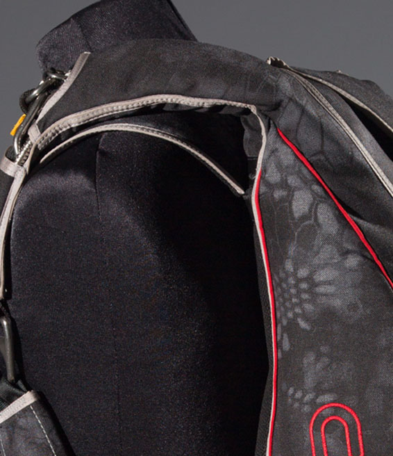 The first is the contoured Bio Curv backpad shaping that allows for the container to “conform” to the curve of the human back.This allows the containers to be held tighter and more comfortably to the back, keeping the containers from moving either up and down or sideways. The Bio Curv backpad also allows for additional volume in the main container while keeping the profile flatter and cleaner, extremely important in maintaining the fit and balance of the containers.
